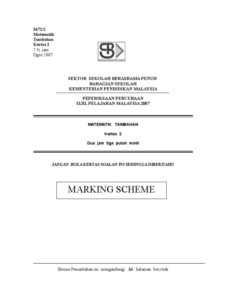 Spm Percubaan 2007 Sbp Add Maths Paper 2 Marking Scheme Quadratic Equation Equations