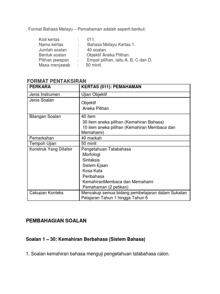 Format Bahasa Melayu Pemahaman Adalah Seperti Berikut