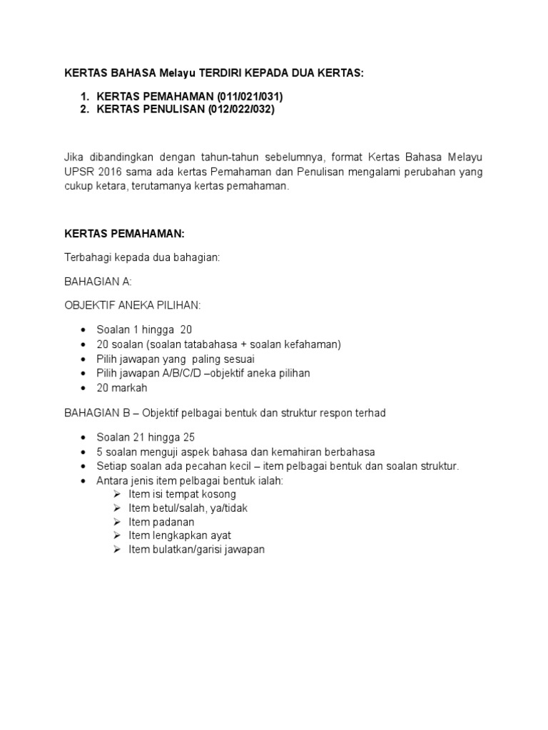 Format Baharu Upsr 2016 Bm 1 Pemahaman